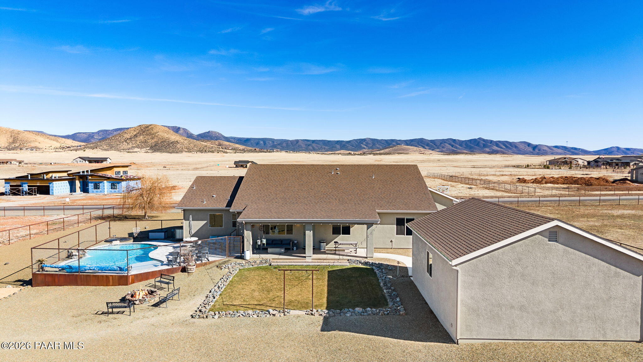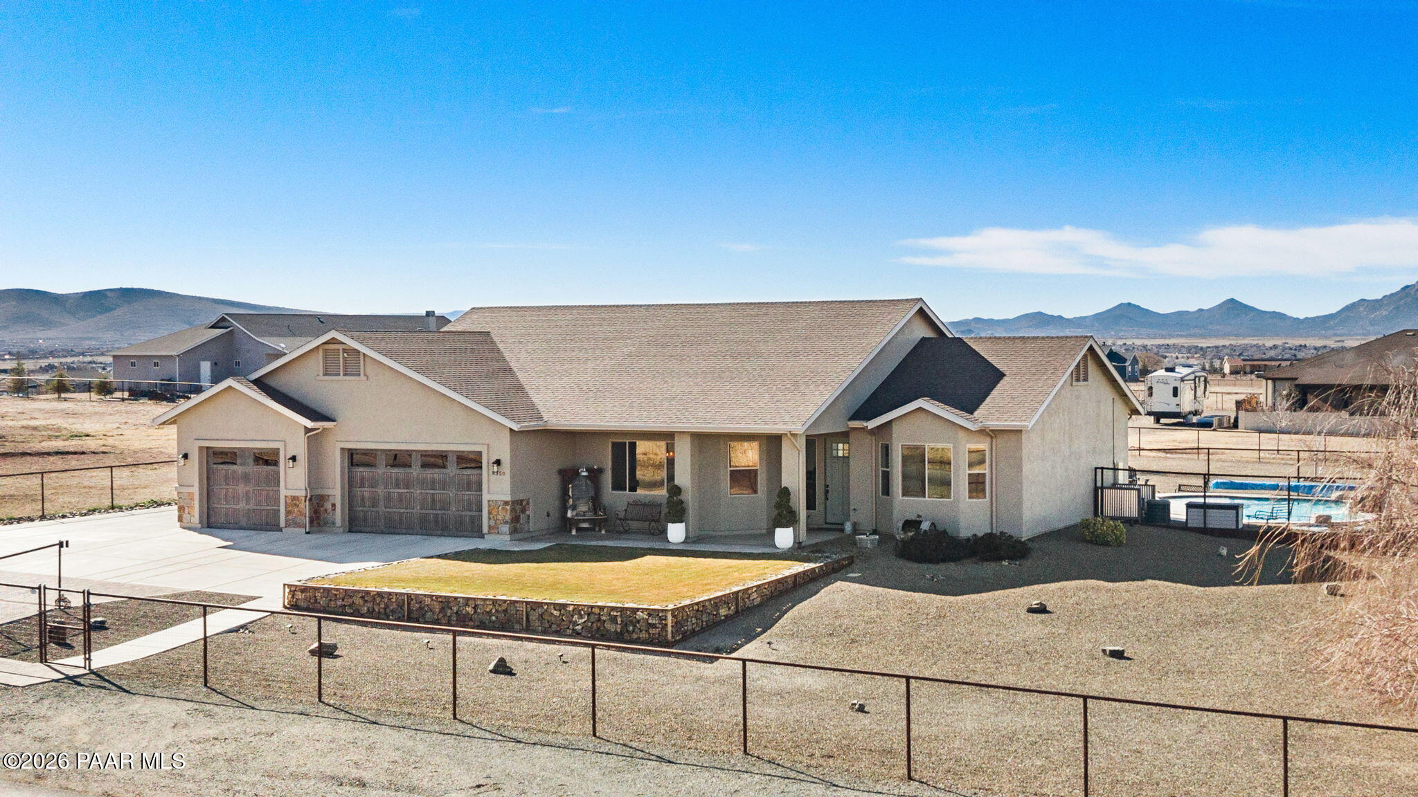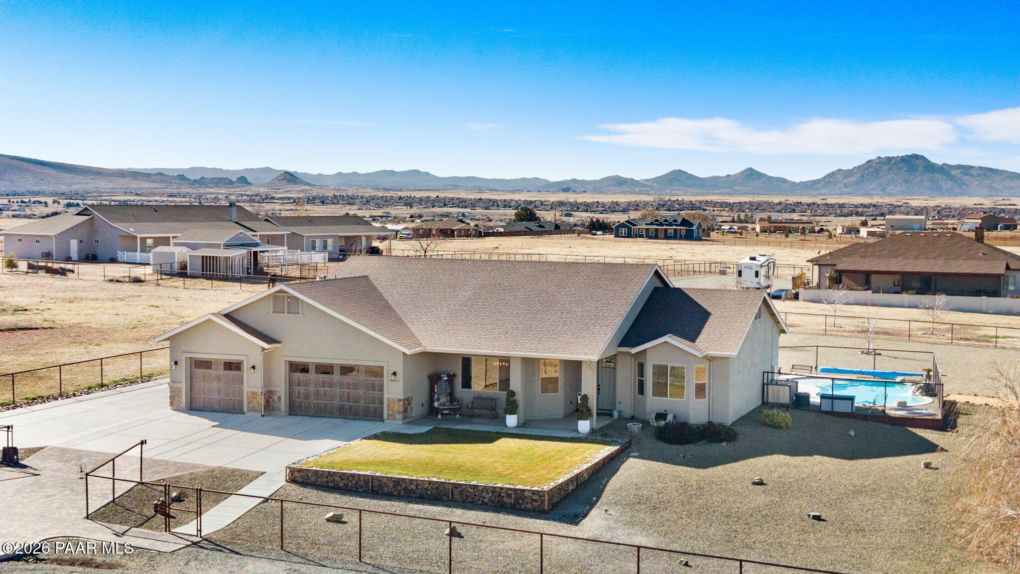 Immaculate 2,300 sq ft, 4-bedroom, 2-bath residence set on two beautifully purposed acres, offering an exceptional blend of refined living and rural functionality. Thoughtfully designed with comfort and versatility in mind, this property is truly one of a kind.The open-concept interior is anchored by a stunning kitchen featuring rich custom cabinetry, granite countertops, a spacious island, walk-in pantry, and seamless connection to the living and dining areas--ideal for both entertaining and everyday living.Outdoors, enjoy your own private retreat with a crystal-clear saltwater in-ground pool, expansive patio, and one acre of professionally landscaped grounds, perfect for hosting or unwinding under wide-open skies. The additional acre of pasture provides excellent space for animals, hobbies, or future expansion.Exceptional garage and storage options include an attached multi-car garage plus a 24' x 30' detached garage, ideal for a workshop, recreational vehicles, or extra storage.Offering privacy, space, and resort-style amenities, this remarkable property delivers the rare opportunity to enjoy luxury outdoor living, usable acreage, and a move-in-ready home--all in one peaceful setting.